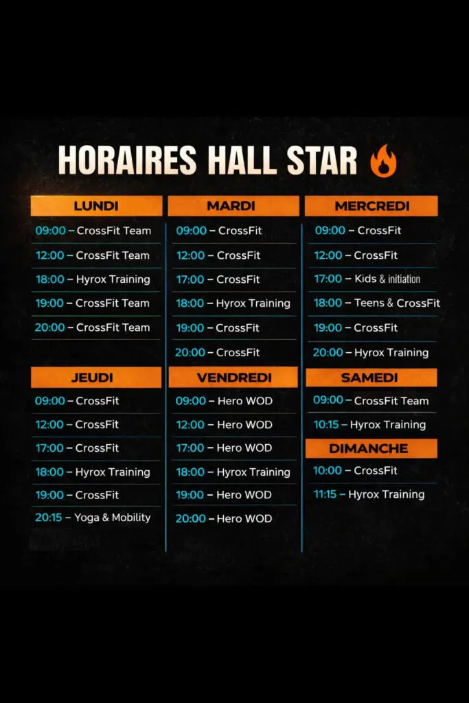 CrossFit, Hyrox, Hero WOD, Yoga & Mobility… La semaine s’organise autour de plus de 30 créneaux pour vous permettre de trouver le rythme qui vous correspond.